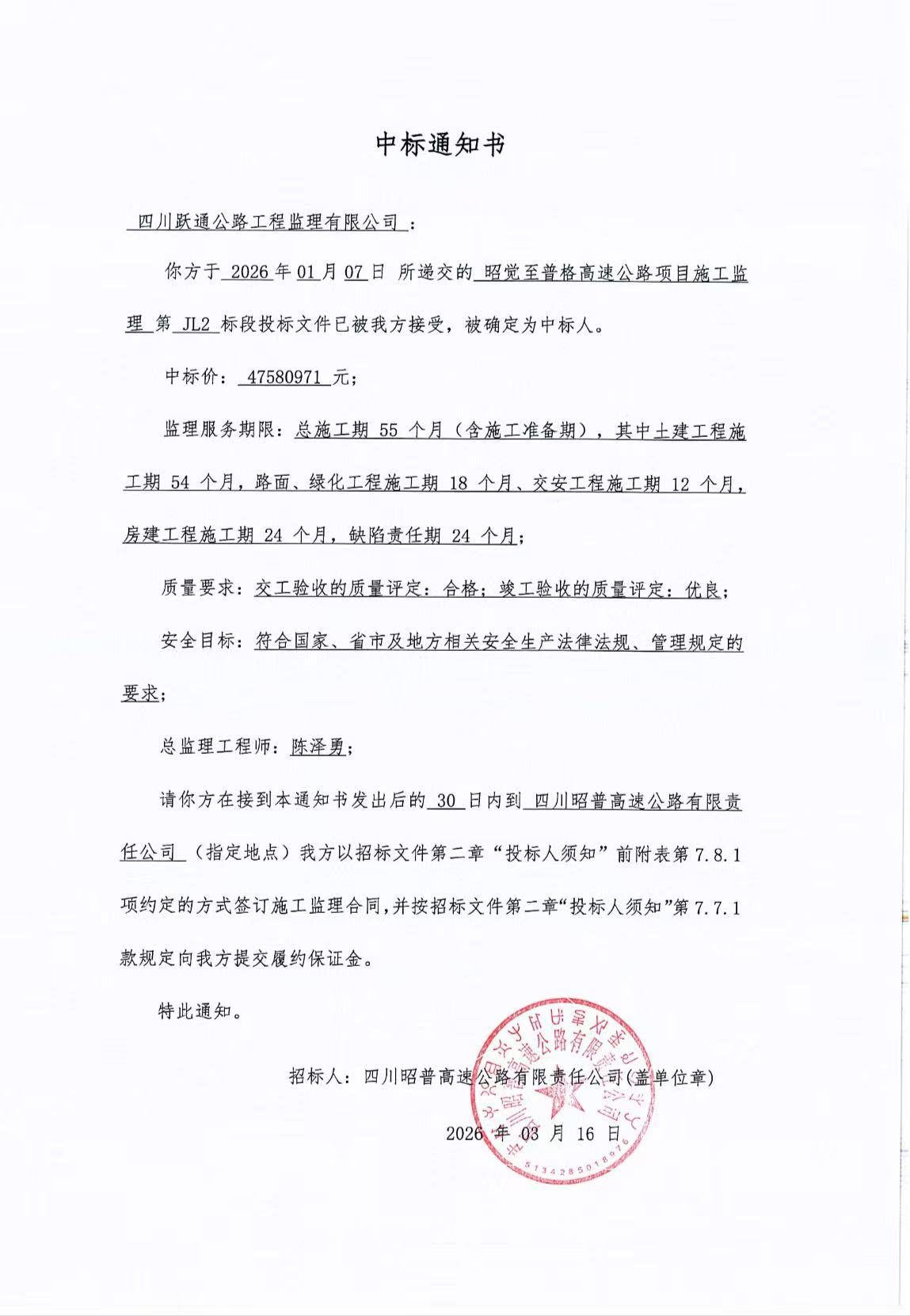 2026年3月16日,四川跃通公路工程监理有限公司凭借深厚的行业积淀、过硬的专业实力、完善的监理方案及良好的市场履约口碑,成功中标“昭觉至普格高速公路项目施工监理JL2标段”工程,续写公司在交通监理领域的奋进篇章。